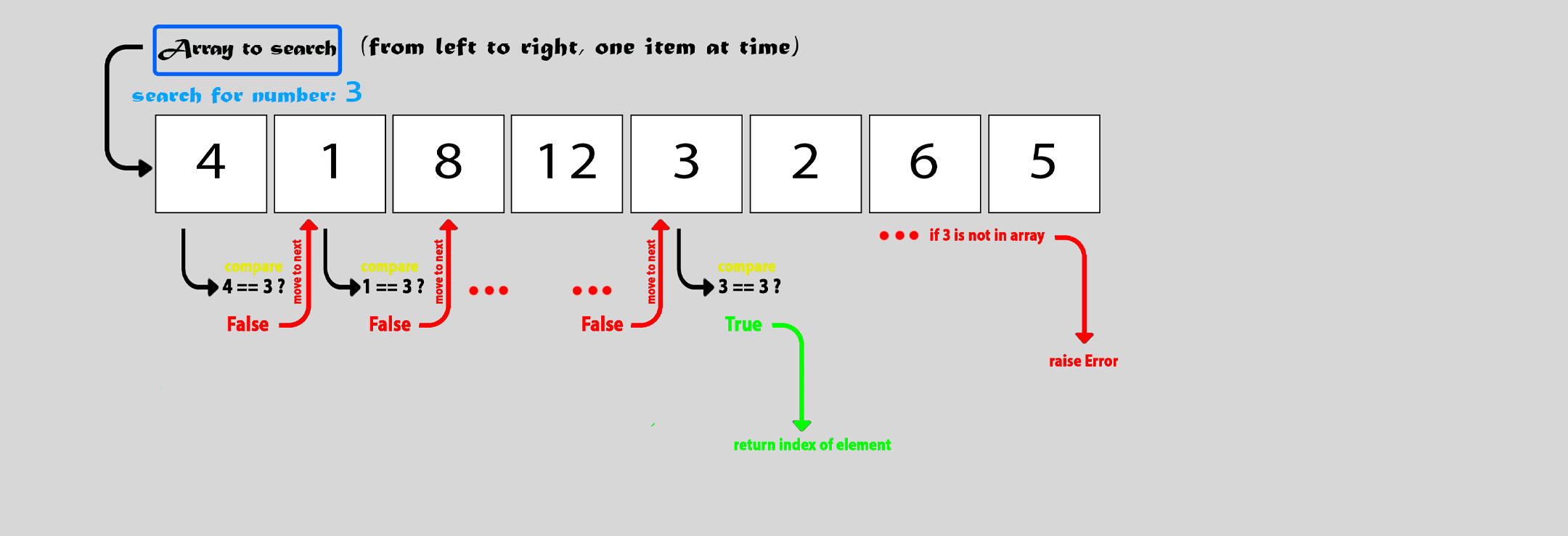 Starts from left-most element, compares it with target - if matched, returns index of that element; if not, moves to next one, compares it...